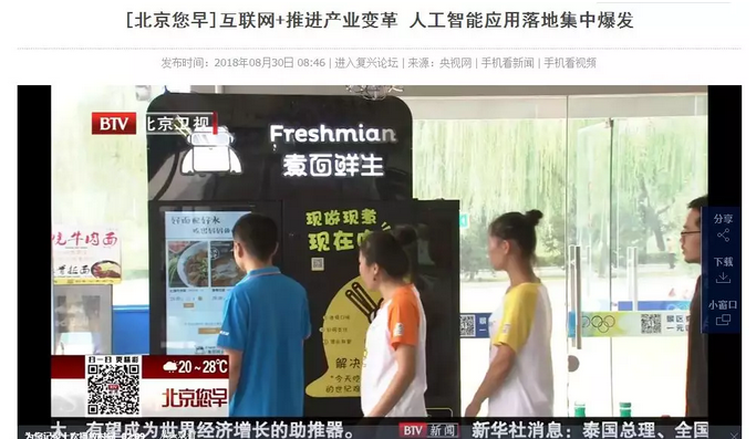 2018年8月30日早,萬杰智能熟面機在北京衛視的《北京您早》欄目中亮相,與智能音箱、在線教育等產品一起,向公眾展示人工智能技術研發與產業應用的最新進展。 https://v.qq.com/x/page/k077205p6na.html