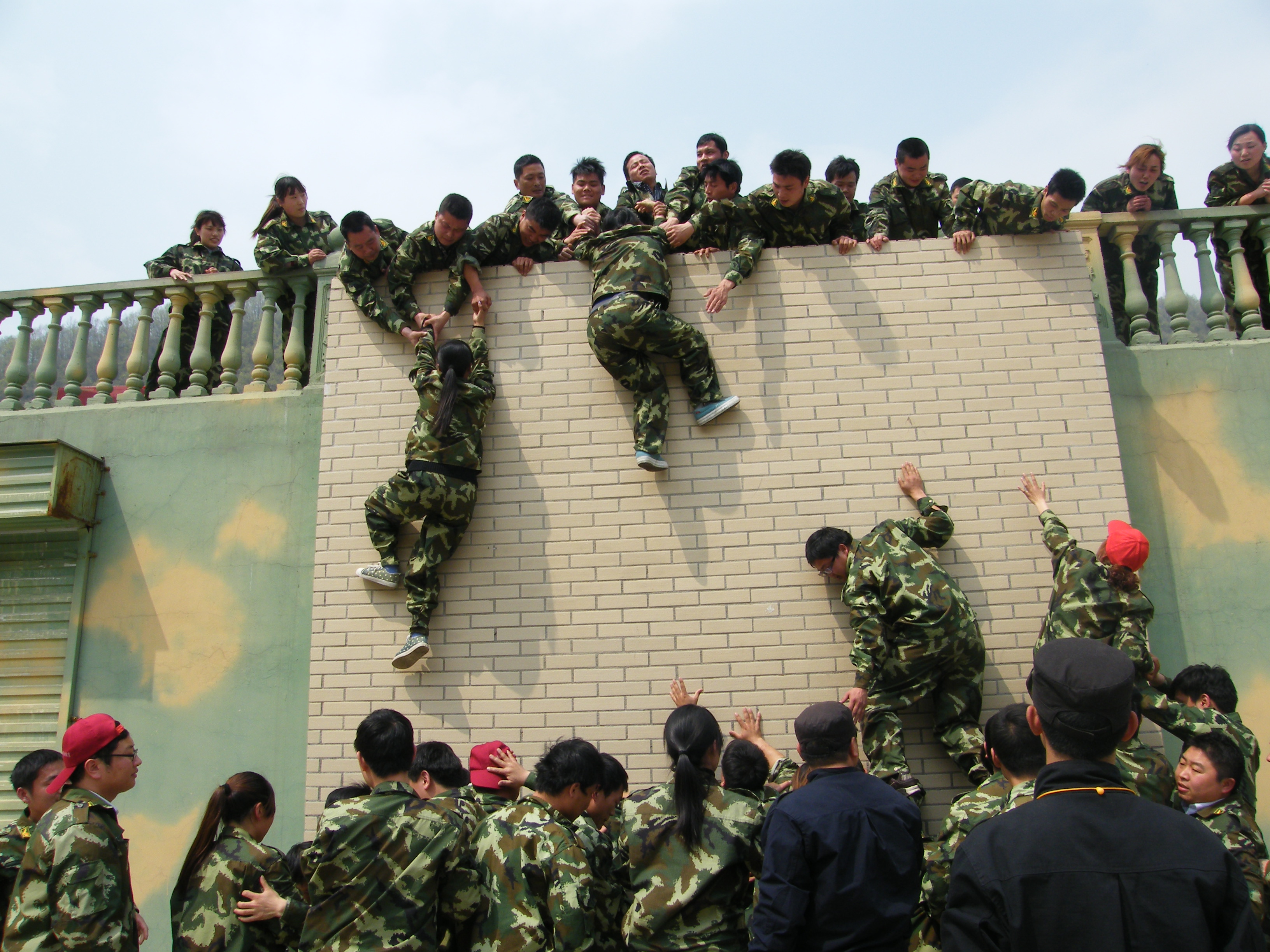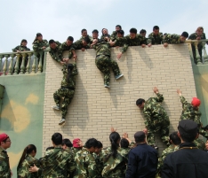 畢業(yè)墻:每個(gè)人都要翻越一堵大約4米且垂直的圍墻,這又是一個(gè)必須依靠集體的力量才能完成的項(xiàng)目。剛開始,大家都認(rèn)為這是很難完成而且比較危險(xiǎn)的任務(wù),估計(jì)需要半個(gè)小時(shí),甚至一個(gè)小時(shí)才能全部通過。 通過集思廣益,我們擬定了計(jì)劃,采用“疊人墻”的方法,讓身強(qiáng)力壯的隊(duì)員作為底座,先由兩三位隊(duì)員踩在他們的肩膀,大家奮力將他們先托上高墻,然后他們?cè)谏厦娼討?yīng),其他同伴踩著底座同伴的肩膀,一個(gè)一個(gè)成功地翻越了高墻。整個(gè)過程歷時(shí)不過5分鐘,活動(dòng)結(jié)束后,所有隊(duì)員都為自己和團(tuán)隊(duì)的精彩表現(xiàn)鼓掌、歡呼,那一刻的場(chǎng)面激動(dòng)人心! 此項(xiàng)目心得體會(huì):首先要感謝作為底座的幾位隊(duì)友,十幾個(gè)同伴踩在他們的肩膀上,汗水、沙土粘滿了衣服,肩膀被踩出紅紅的血痕。他們的奉獻(xiàn)和付出,換來了團(tuán)隊(duì)的成功。無論在工作還是生活中,只有放下自私、愿意付出、為別人著想、才能成就自己,完成目標(biāo)。